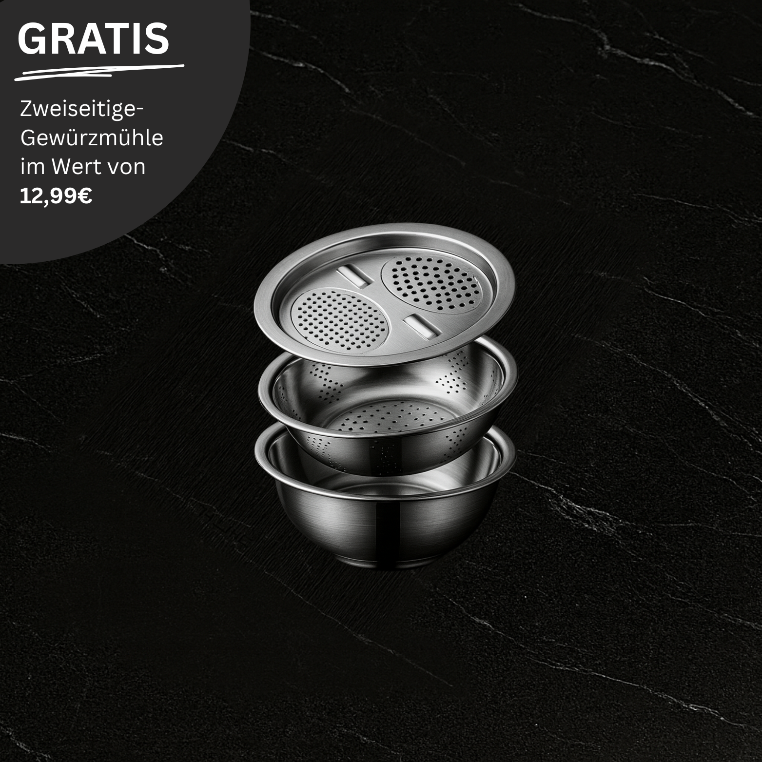 Extrem praktisch! Besonders die integrierte Reibefunktion nutze ich ständig. Die Schüsseln sind stabil, stapelbar und ideal für die Küche. Klare Empfehlung